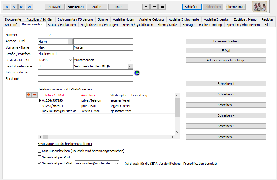 In dieser Ansicht sehen Sie in der aktuellen Verwaltung einen Datensatz im Detail. Sie können auswählen, welche Register angezeigt werden sollen siehe hier.